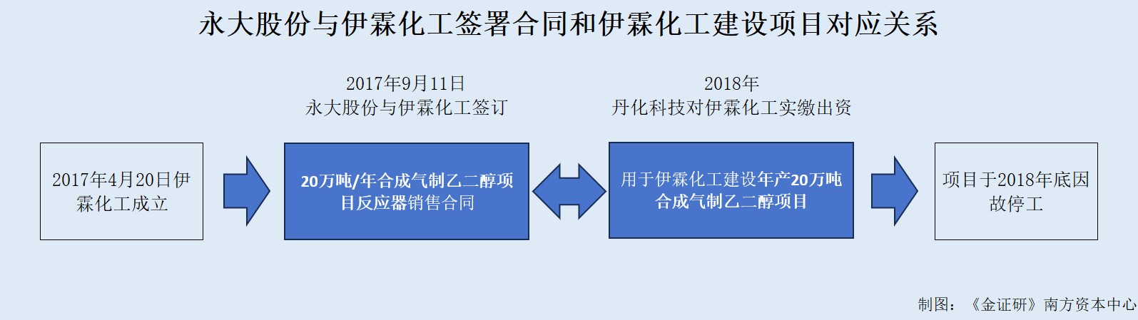 简言之,2017年,永大股份曾与伊霖化工签订《20万吨/年合成气制乙二醇项目反应器销售合同》,合同总价为5,200万元。伊霖化工未支付后期款项曾被永大股份起诉,后因应诉手续无法送达而被驳回诉讼请求。在此背景下,2018年,永大股份客户丹化科技的子公司曾出资入股伊霖化工,拟建设年产20万吨合成气制乙二醇项目,项目于2018年底因故停工。