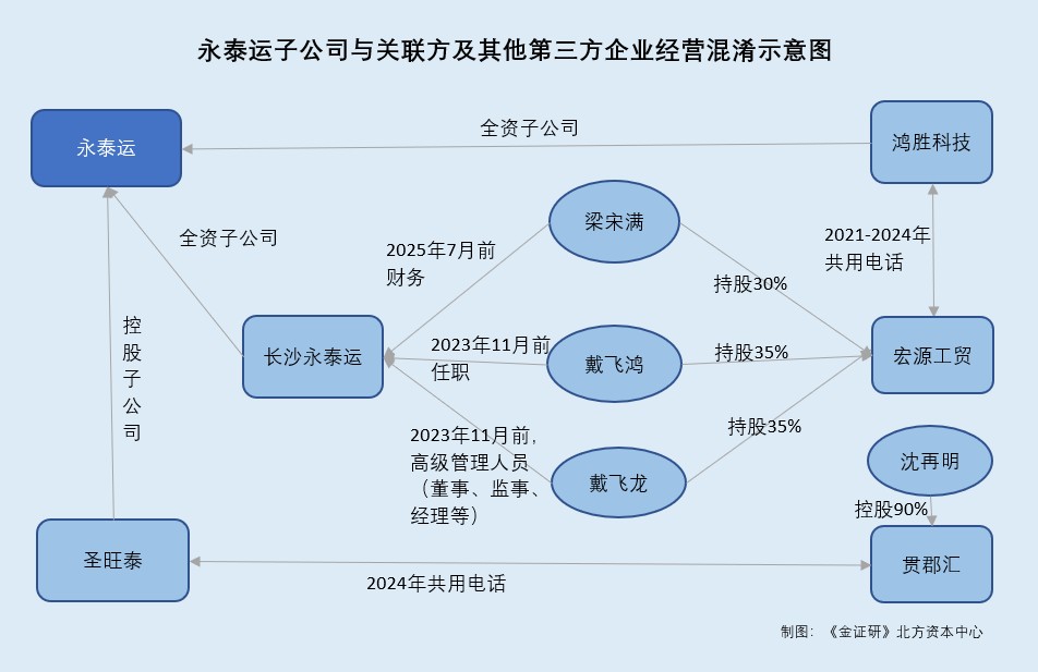 简言之,鸿胜科技及长沙永泰运均系永泰运2023年通过破产重整项目取得100%股权的子公司。截至2023年11月,戴飞鸿、戴飞龙、梁宋满等人为长沙永泰运的高级管理人员。截至2025年7月,梁宋满为长沙永泰运财务负责人。