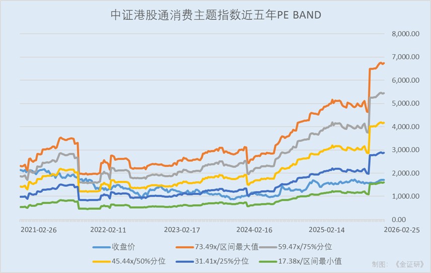 在指数市盈率和市净率两大指标上,截至2026年2月25日,中证港股通消费主题指数滚动市盈率为27.52,市净率为3.15, PE/PB Band均接近五年内区间最小值。