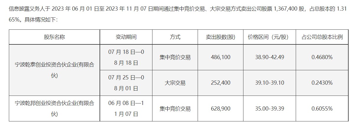 据永泰运签署于2023年11月10日的《简式权益变动报告书(宁波乾泰、宁波乾邦)》,2023年6月1日至2023年11月7日期间,宁波乾泰及宁波乾邦通过集中竞价交易、大宗交易方式卖出其持有的永泰运股票136.74万股,占彼时永泰运总股本的1.3165%。