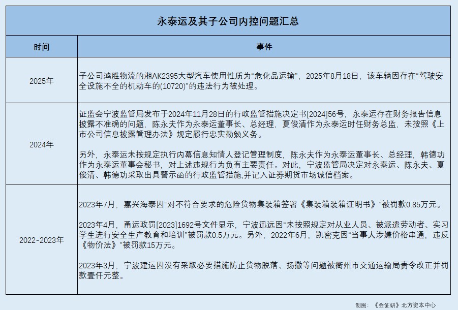 2025年10月,证监会修订发布《上市公司治理准则》,旨在推动上市公司不断健全现代企业制度、提升规范运作水平。在此背景下,2024年,永泰运及其实控人因永泰运财务信披不准确等问题被证监局出具警示函。且近三年又一期,永泰运子公司因涉嫌价格串通、重点车辆违法等情形被处罚。