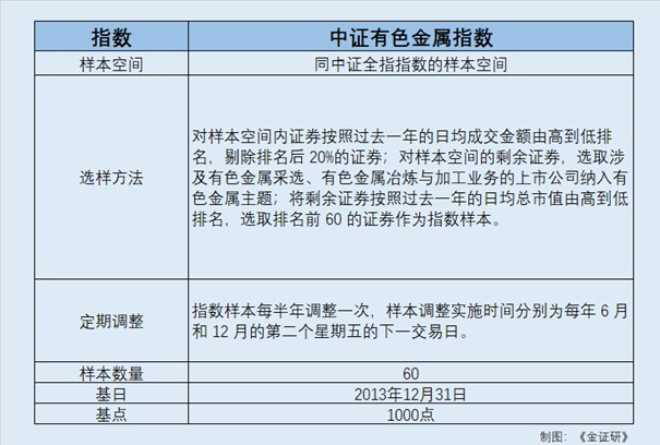 在样本空间上,中证有色金属指数以中证全指为样本空间,对样本空间内证券按照过去一年的日均成交金额由高到低排名,剔除排名后20%的证券。在筛选过程中优先剔除流动性不足的标的,保证指数具备良好的市场代表性与交易可行性。