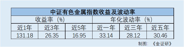 此外,中证有色金属指数还展现出典型的高弹性,年化波动率近1年、近3年、近5年年化波动率分别为33.14%、28.12%、30.46%。