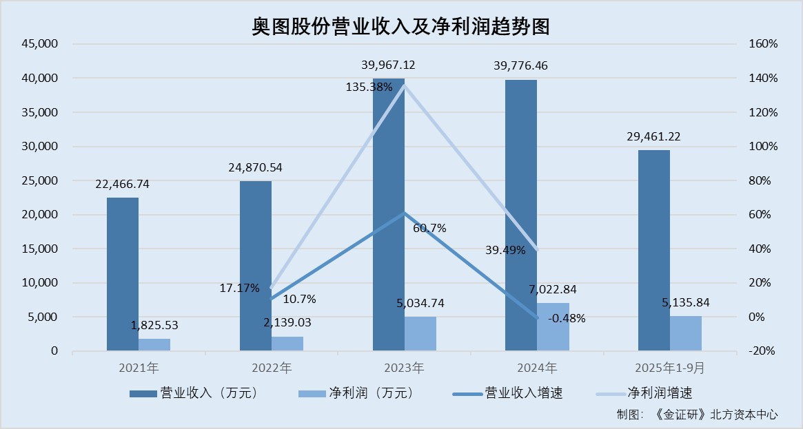 根据《金证研》北方资本中心测算,2022-2024年及2025年1-9月,奥图股份的营业收入同比增速分别为10.7%、60.7%、-0.48%、-0.3%,净利润同比增速分别为17.17%、135.38%、39.49%、-3.63%。