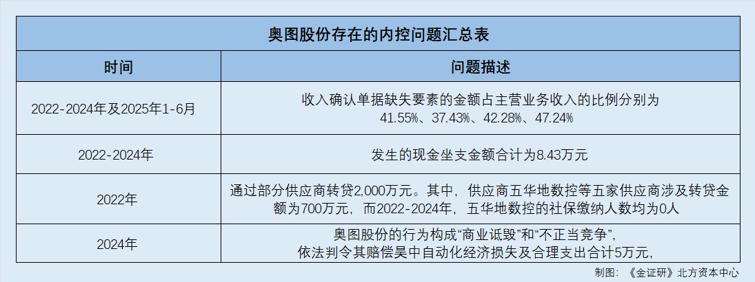 综合而言,2022-2024年及2025年1-6月,奥图股份收入确认单据缺失要素的金额占主营业务收入的比例增长至超四成,发生坐支现金的合计金额8.43万元,且奥图股份称已完成整改。此外,2022年,奥图股份曾通过五华地数控等五家供应商合计转贷700万元,而五华地数控2020-2024年社保缴纳人数均为0人。且2022年,五华地数控向奥图股份找回票据35万元。不仅如此,回溯历史,昊中自动化官网披露,2024年奥图股份因成商业诋毁和不正当竞争,被判令道歉并赔偿昊中自动化损失。