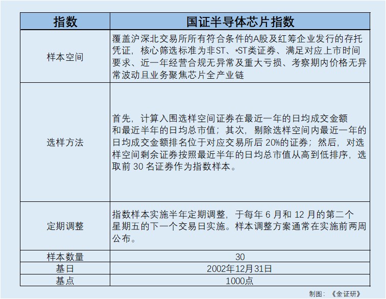 国证半导体芯片指数以2002年12月31日为基日,基点为1,000点,其编制流程严格遵循“选样空间界定—流动性筛选—市值排序—样本确定—定期调整”的逻辑,确保指数样本具备良好的流动性、代表性与成长性。