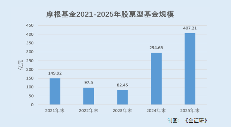 而摩根基金旗下股票型基金方面,2021-2025年末的资产规模分别为149.92亿元、97.5亿元、82.45亿元、294.65亿元以及407.21亿元。短短两年时间,股票型基金的资产规模增长超300亿元。
