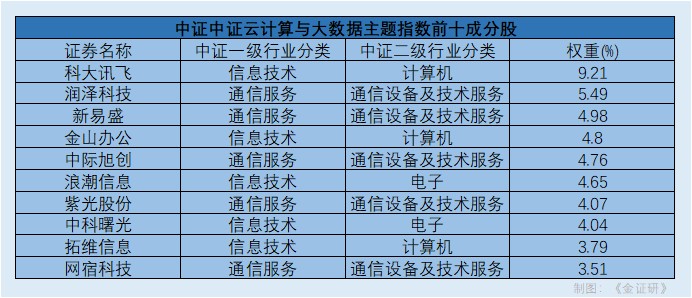以中证云计算与大数据主题指数为例,截至2026年3月19日,该指数前十成分股为科大讯飞、润泽科技、新易盛、金山办公、中际旭创、浪潮信息、紫光股份、中科曙光、拓维信息、网宿科技。成分股多以硬件供应商为主。