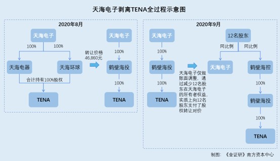 简言之,2020年8月起,天海电子通过两次股权转让的方式剥离TENA,TENA的控制权最终落到天海电子当时的12名股东同比例持股的企业鹤壁海控之下。