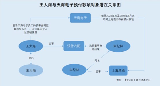 值得关注的是,王大海与朱纪林分别担任沃什汽配的监事、执行董事兼总经理。在此背景下,2023年末及2025年6月末,天海电子对上海质杰存在预付款项。而且上海质杰的监事名为朱纪林,且天海电子员工持股平台股东“朱劲林”与朱纪林姓名仅“一字之差”。上述同名背后,天海电子的原员工王大海与预付对象上海质杰监事朱纪林或关系待解。