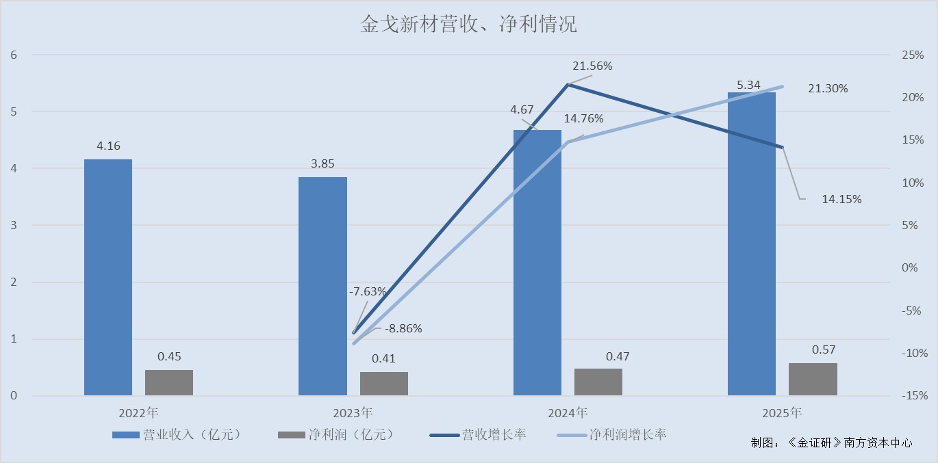 2022-2025年,金戈新材的营业收入分别为4.16亿元、3.85亿元、4.67亿元、5.34亿元;净利润分别为4,530.73万元、4,129.46万元、4,738.91万元、5,748.27万元。
