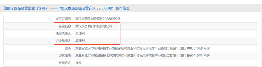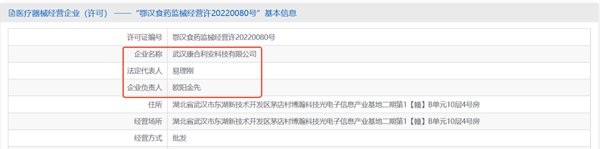 即是说,至少2016年5月至2025年9月26日,科莱瑞迪存在名为“欧阳金先”的员工,与科莱瑞迪关联方康合利安的“鄂汉食药监械经营许20220080号”医疗器械经营许可证上截至2023年3月8日的企业负责人“欧阳金先”同名,而后该许可证的企业负责人变更为易理刚。
