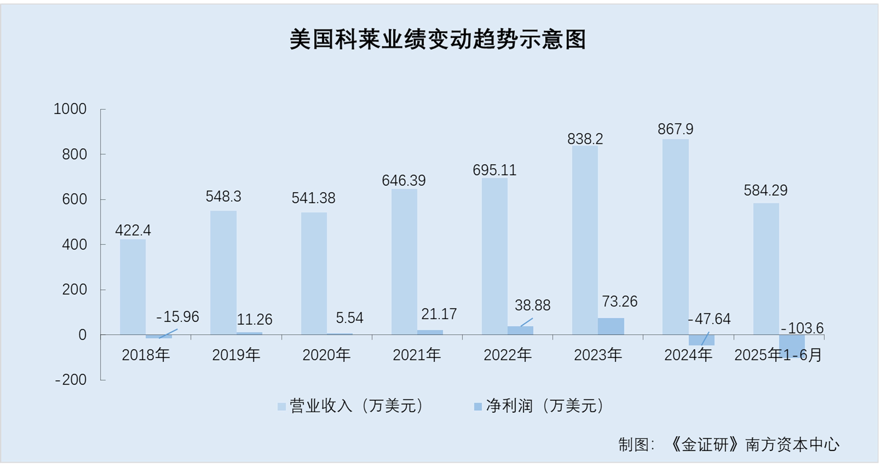 据2022年5月26日创业板首轮问询回复及2025年12月15日北交所二轮问询回复,2018-2024年及2025年1-6月,美国科莱的营收为422.41万美元、548.39万美元、541.38万美元、646.39万美元、695.11万美元、838.2万美元、867.92万美元、584.29万美元。