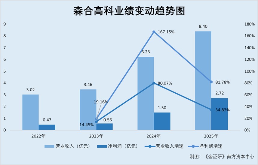 2022-2025年,森合高科的净利润分别为0.47亿元、0.56亿元、1.5亿元、2.72亿元。2023-2025年,森合高科净利润的同比增速分别为19.16%、167.15%、81.78%。