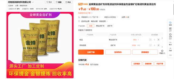 此外,据认证主体为嵩尚新材的“1688店铺”,截至查询日2026年4月7日,其在售有“金蝉黄金选矿剂非氰浸金剂环保提金剂金银矿石堆浸剂黄金浸出剂”产品,库存为999袋。并且产品信息显示,金蝉黄金选矿剂有“源头工厂、加工定制、环保提金、回收率高”等特征。