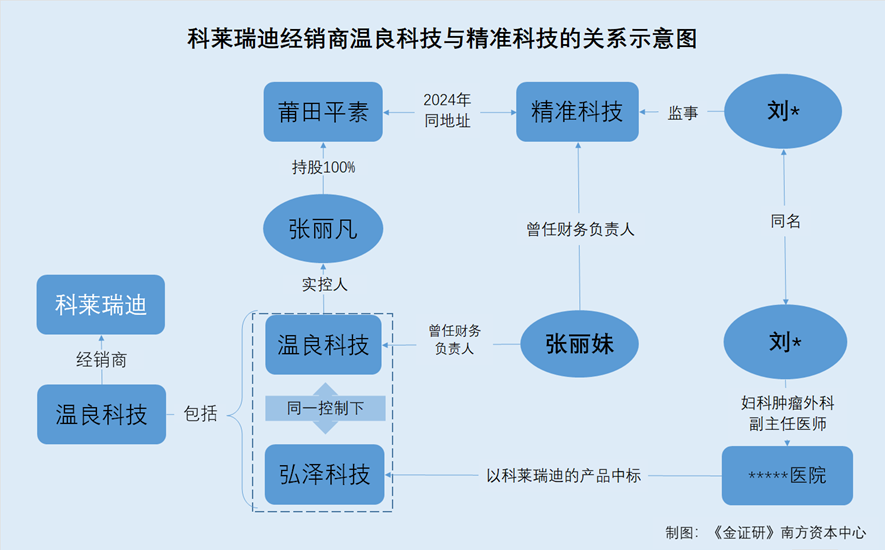 值得关注的是,莆田普泽科技有限公司(福建省温良科技有限公司的曾用名,以下统称“温良科技”)为科莱瑞迪的主要境内经销商之一。温良科技与精准科技(莆田)有限公司(以下简称“精准科技”)的注册地址相同,且前财务负责人或也存重叠。“刘*”是精准科技的监事,而2023年温良科技受同一控制的经销商以科莱瑞迪产品中标医院项目,该医院的一名医师也名为“刘*”。