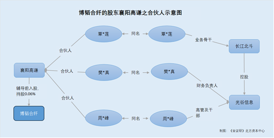 上述可知,2024年6月,襄阳高谦增资入股博韬合纤,次年1月博韬合纤签订上市辅导协议。且襄阳高谦的合伙人包括覃*莲、周*峰、樊*真襄阳。研究发现,同名“覃*莲”系国企长江北斗的业务骨干;同名的“樊*真”及“周*峰”分别为长江北斗控股的光谷信息的财务负责人及高管。