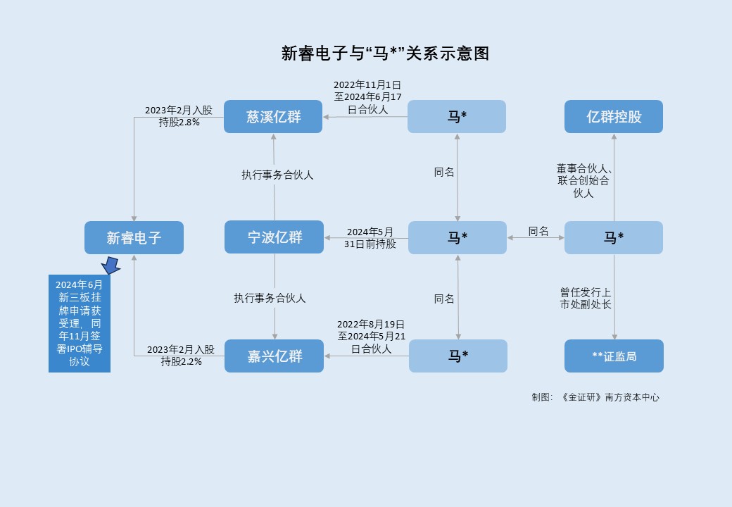 此番上市,嘉兴亿群、慈溪亿群均系新睿电子的私募股东。2023年2月,前述两家私募股东入股新睿电子。宁波亿群系嘉兴亿群及慈溪亿群的执行事务合伙人兼基金管理人。而“马*”曾系嘉兴亿群、慈溪亿群、宁波亿群的合伙人之一。2024年5-6月,“马*”先后将其持有的嘉兴亿群、慈溪亿群、宁波亿群股权全部转出。2024年6月28日,新睿电子新三板挂牌申请文件获受理。