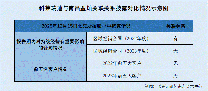 此外,在2025年12月15日北交所招股书“前五名客户情况”部分,2022-2023年,南昌益灿分别为科莱瑞迪的第四大客户、第五大客户,科莱瑞迪与南昌益灿不存在关联关系。