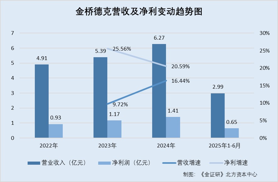 据金桥德克签署于2025年12月29日的招股说明书(以下简称“签署于2025年12月29日的招股书”),2022-2024年及2025年1-6月,金桥德克的营业收入分别为4.91亿元、5.39亿元、6.27亿元、2.99亿元;同期,净利润分别为0.93亿元、1.17亿元、1.41亿元、0.65亿元。