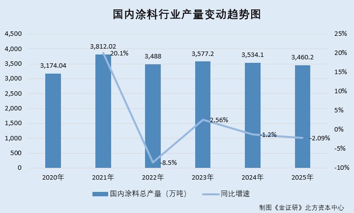 经测算,2021-2025年,国内涂料行业总产量增速分别为20.1%、-8.5%、2.56%、-1.2%、-2.09%。