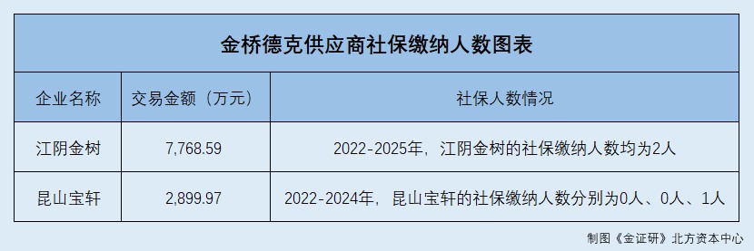 综上而言,2022-2024年及2025年1-6月,江阴金树系金桥德克交易额合计超七千万元的供应商,2022-2025年,江阴金树社保缴纳人数均为2人。此外,昆山宝轩系金桥德克交易超两千万元的供应商,2022-2024年,昆山宝轩社保缴纳人数未超过1人。巧合的是,昆山宝轩自成立起注册地址均位于周市镇长江北路290号宝成国际大厦1层507室。而2021年9月6日前,金桥德克的关联方江苏轩铁的注册地址为昆山市周市镇长江北路290号宝成国际大厦507室。