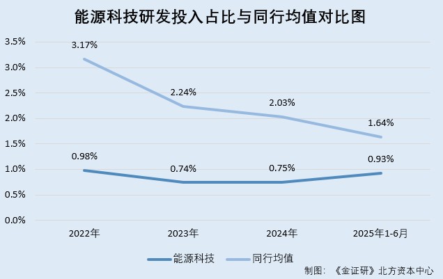 据签署于2025年12月24日的招股书,2022-2024年及2025年1-6月,能源科技的研发投入占营业收入的比例分别为0.98%、0.74%、0.75%、0.93%。同期,能源科技同行业可比企业研发投入占营业收入比例的均值分别为3.17%、2.24%、2.03%、1.64%。
