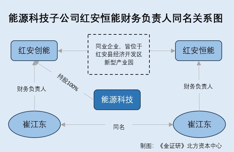 值得注意的是,2017年11月,能源科技收购红安恒创,红安恒创成为能源科技合并范围内的全资子公司。需要说明的是,红安恒创的财务负责人,与位于同一产业园的企业的财务负责人“同名”,且企业的控股股东或系红安恒创的同行。
