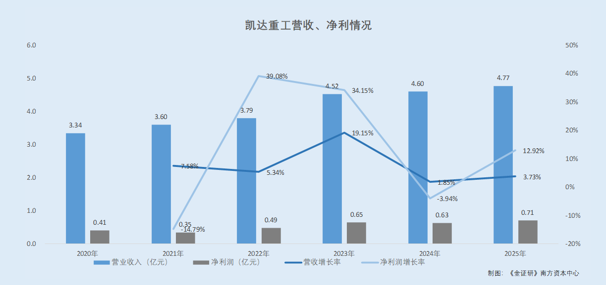据凯达重工于2024年3月4日发布的《前期会计差错更正公告》、签署于2025年6月24日的招股说明书(以下简称“签署于2025年6月24日的招股书”)以及签署于2026年4月17日的招股书,2020-2025年,凯达重工的营业收入分别为3.34亿元、3.6亿元、3.79亿元、4.52亿元、4.6亿元、4.77亿元,2021-2025年,凯达重工的营业收入分别同比增长7.58%、5.34%、19.15%、1.85%、3.73%。