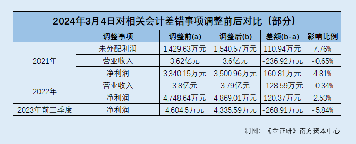具体来看,据凯达重工出具于2024年3月4日的前期会计差错更正公告,对2021年调整的事项包括,未分配利润更正前为1,429.63万元,影响数为110.94万元,更正后为1,540.57万元,影响比例为7.76%;营业收入更正前为36,218.58万元,影响数为-236.92万元,更正后为35,981.66万元,影响比例为-0.65%;净利润更正前3,340.15万元,影响数为160.81万元,更正后为3,500.96万元,影响比例为4.81%。