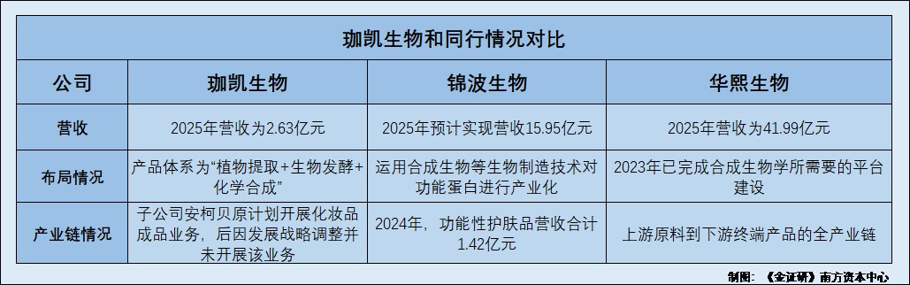 行业方面,2024年,珈凯生物在国内化妆品原料市场的市占率约为0.38%。此外,珈凯生物子公司安柯贝原计划开展化妆品成品业务,后因发展战略调整并未开展该业务。而同行华熙生物拥有上游原料到下游终端产品的全产业链,同行创健医疗和维琪科技亦能生产化妆品相关的成品。另一方面,珈凯生物构建“植物提取+生物发酵+化学合成”的产品体系,产品暂未涉及合成生物,而同行华熙生物、创健医疗等或均已布局合成生物领域。