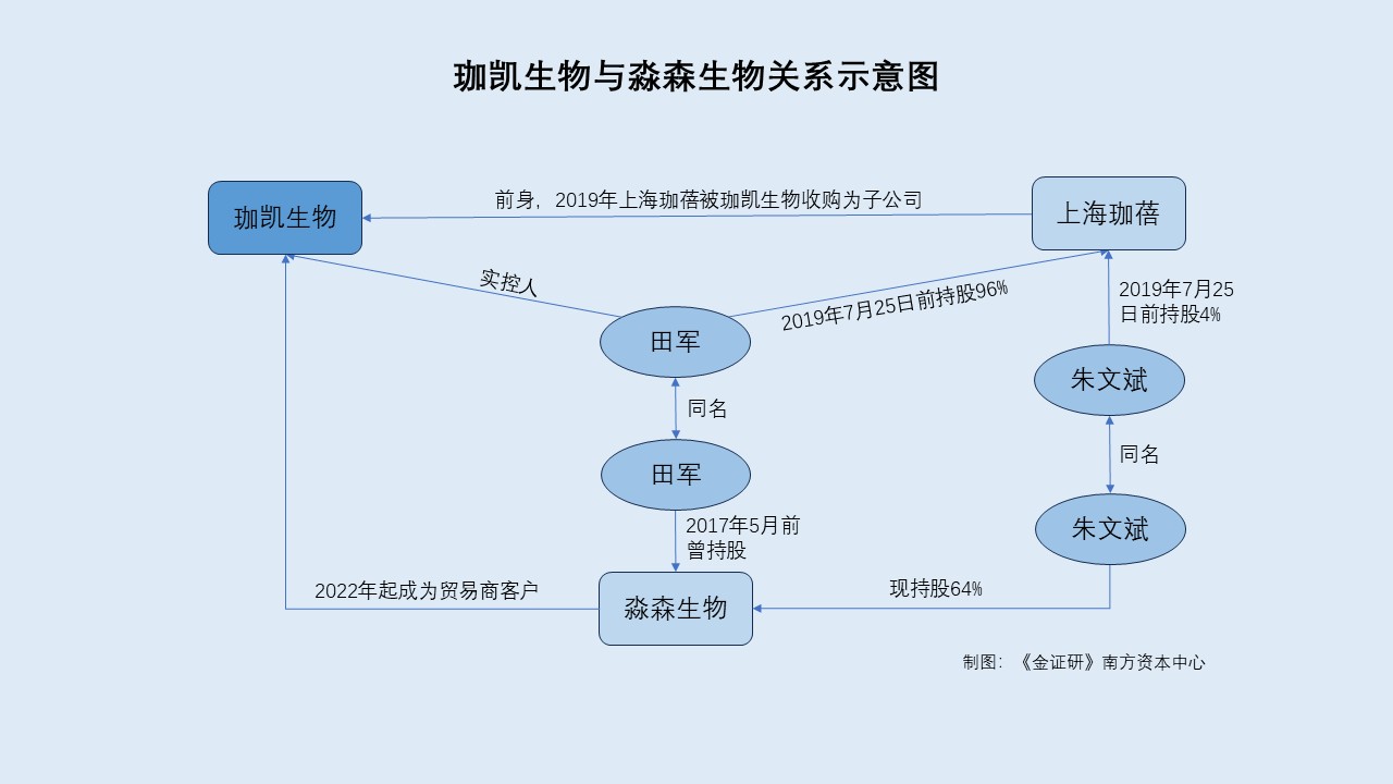 也就是说,上海珈蓓系珈凯生物的前身,珈凯生物实控人田军曾与朱文斌共同持股上海珈蓓。此外,田军、朱文斌或曾共同持股淼森生物。截至查询日2026年4月27日,朱文斌持有淼森生物64%股份。2022年起,淼森生物开始与珈凯生物合作。2024-2025年,淼森生物均系珈凯生物的前十大贸易商客户之一。