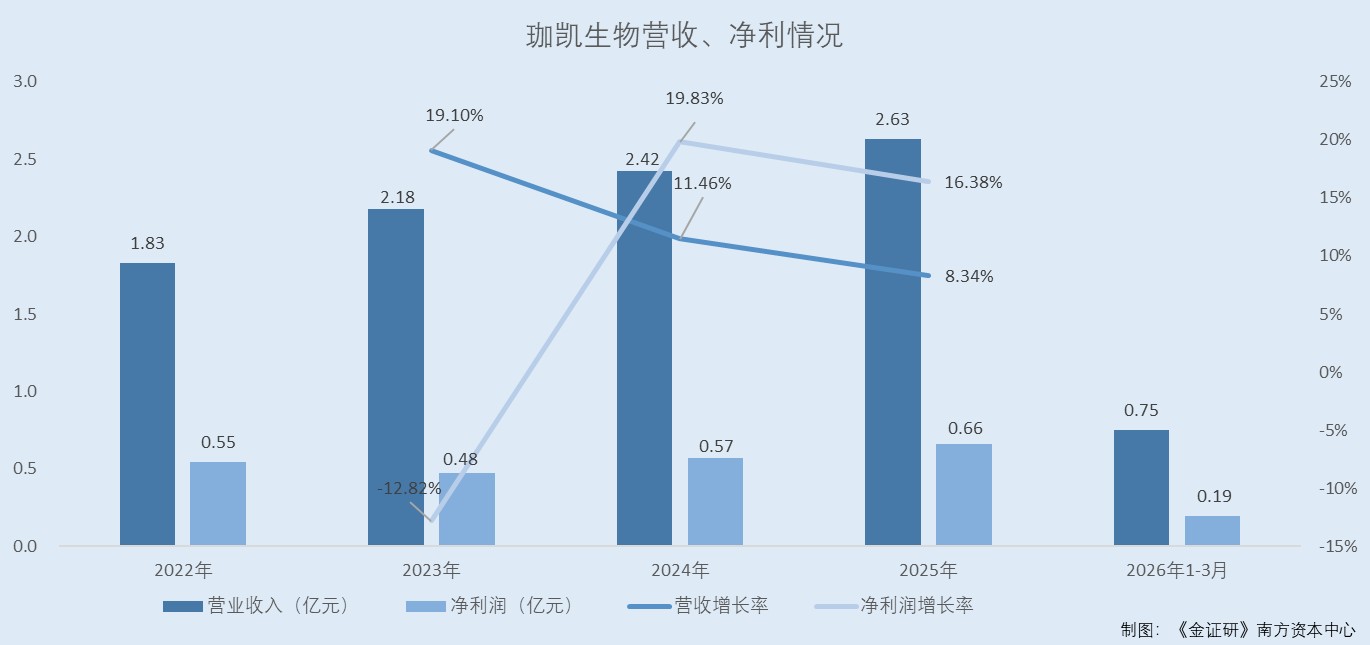 可见,2025年,珈凯生物的营收增速放缓,2026年1-3月,珈凯生物营收增速20.21%,净利润增速为34.32%。