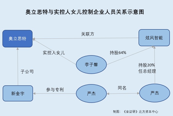 即是说,炫风智能系奥立思特实控人女儿李子馨控股64%的企业,且奥立思特表示其员工均在奥立思特及子公司处专职,与炫风智能不存在人员混同的情形。而公开信息显示,炫风智能最初脱胎于奥立思特,于2024年正式脱离奥立思特并独立运营。且炫风智能持股20%的股东、总经理为严杰,或同时系奥立思特副总经理,且同名“严杰”现身奥立思特子公司新金宇三项专利的发明人名单。