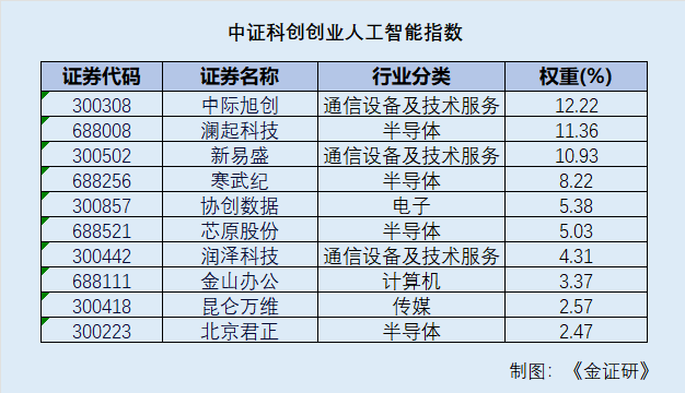 具体来看,中证人工智能主题指数前十大成分股分别为中际旭创、澜起科技、新易盛、寒武纪、协创数据、芯原股份、润泽科技、金山办公、昆仑万维以及北京君正。