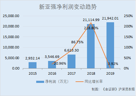 同期,新亚强的净利润分别为2,932.14万元、3,546.69万元、6,623.3万元、21,114.99万元、21,942.01万元,2016-2019年分别同比20.96%、86.75%、218.8%、3.92%。