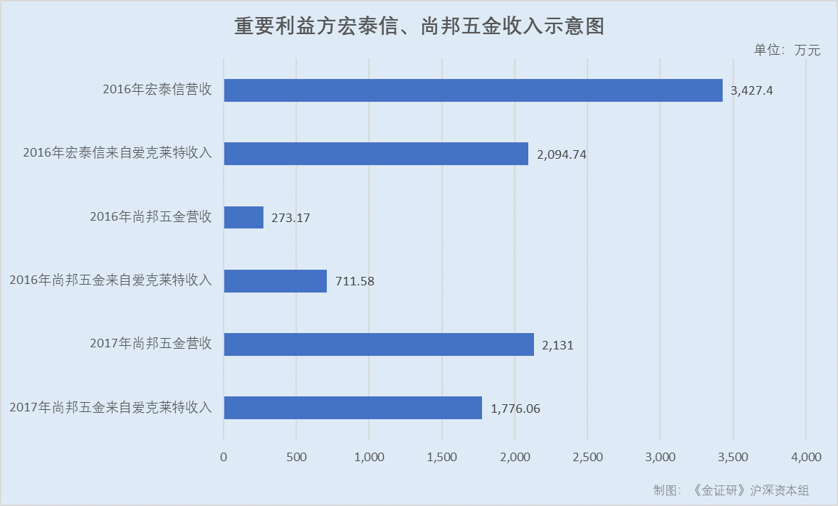 据市场监督管理局数据,2016-2017年,爱克莱特重要利益方宏泰信的营业总收入分别为3,427.4万元、2,016.8万元,净利润分别仅为1.6万元、2.18万元。同期,尚邦五金的营业总收入分别为273.17万元、2,131万元,净利润分别仅为-3.9万元、-29.1万元,令人唏嘘。